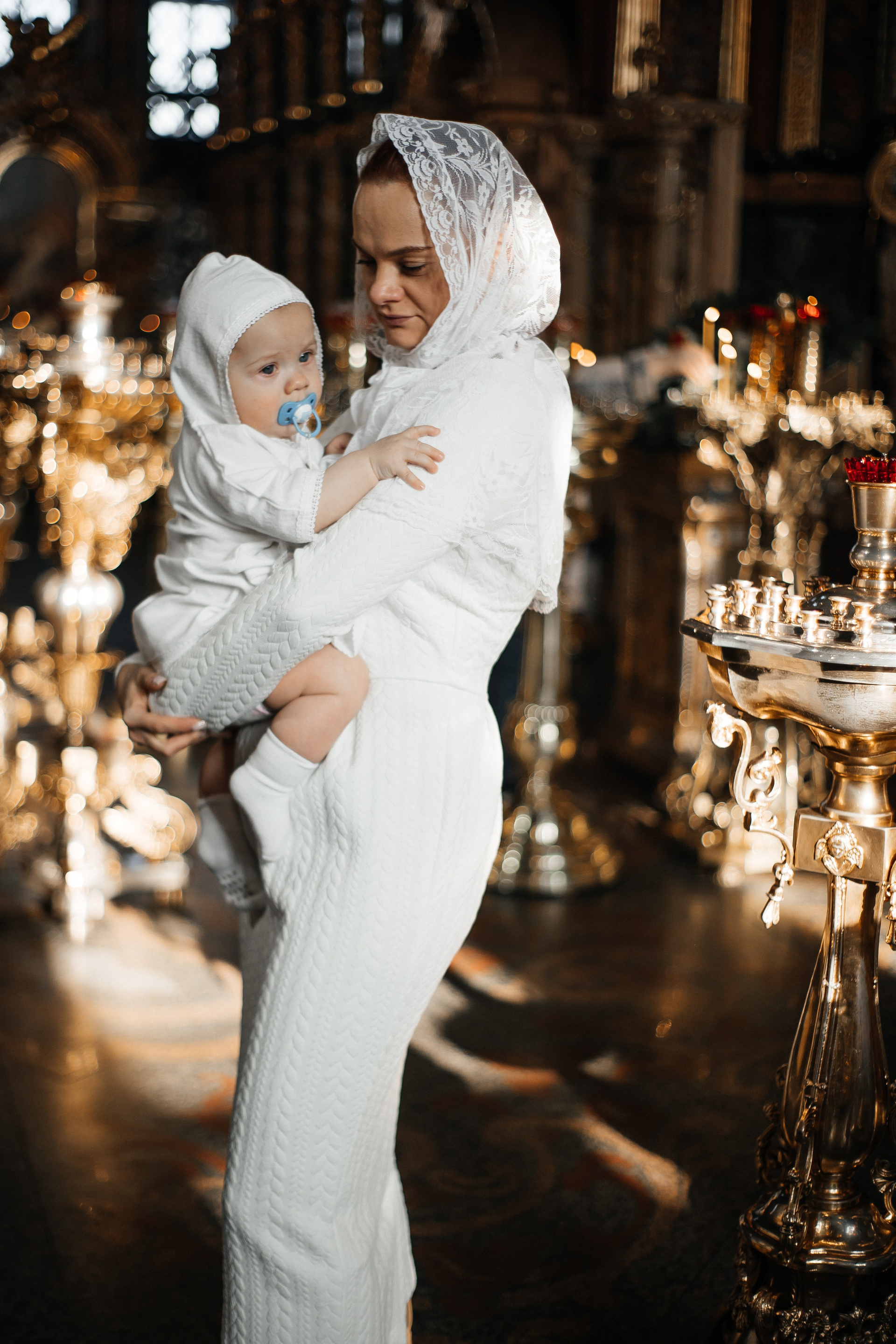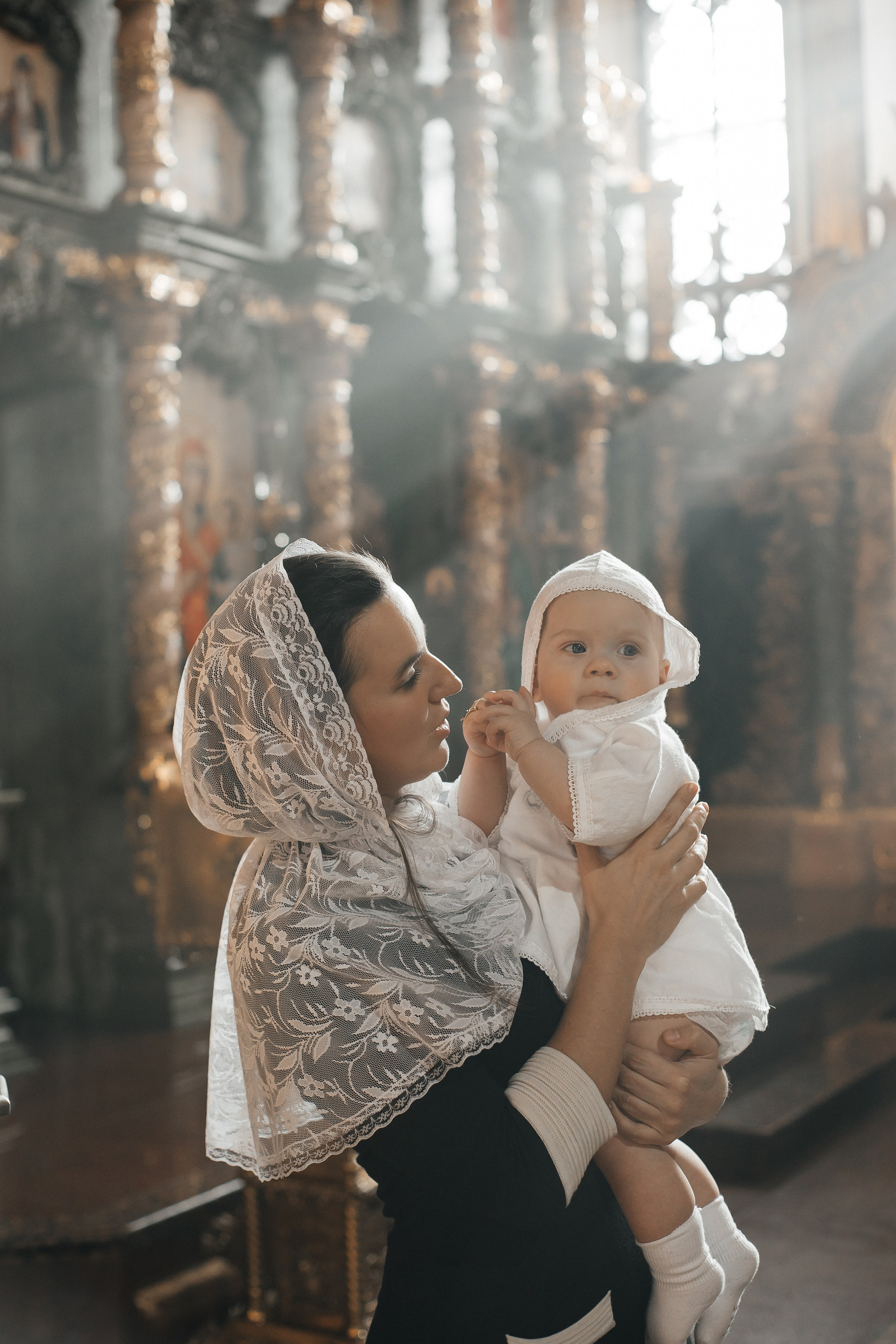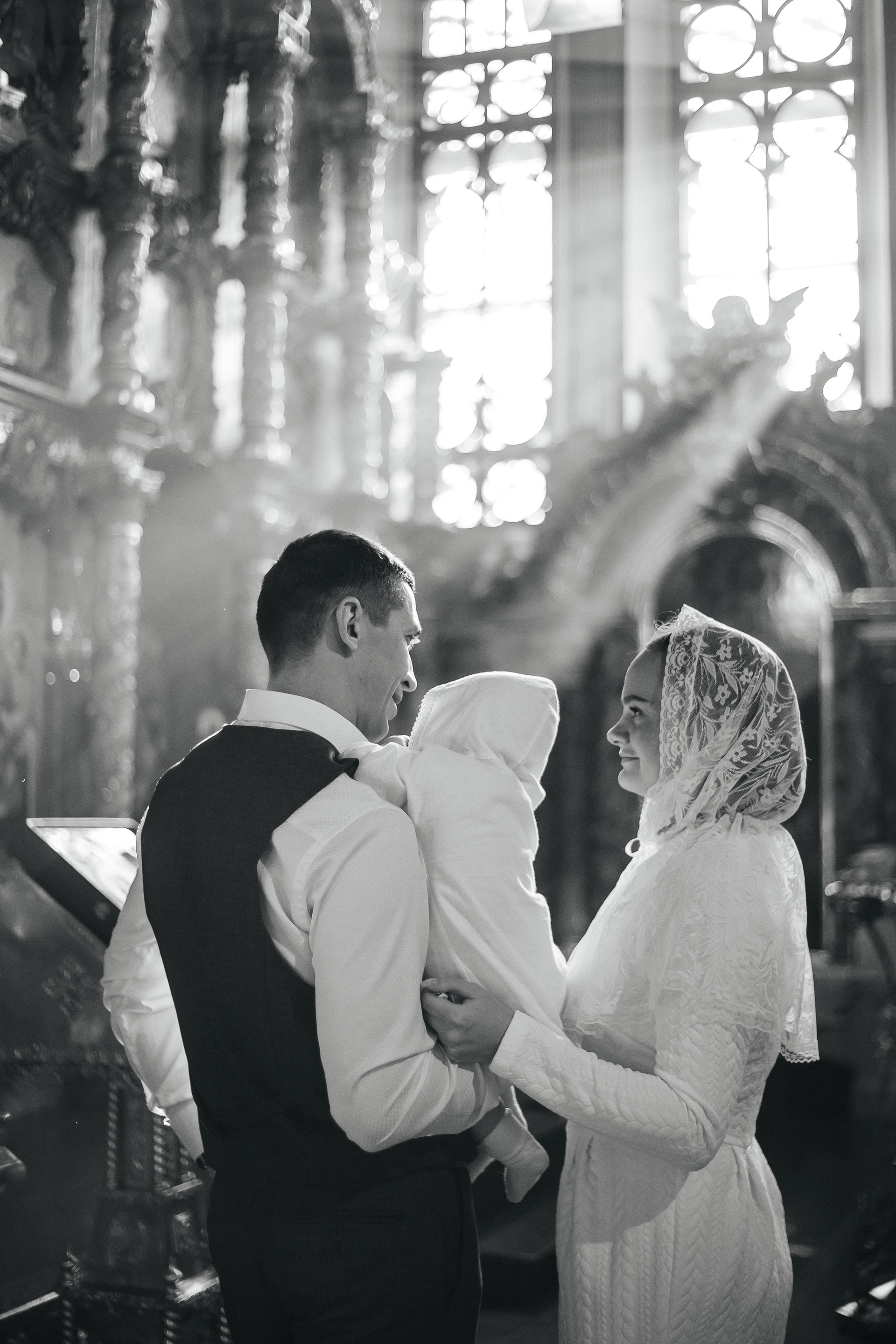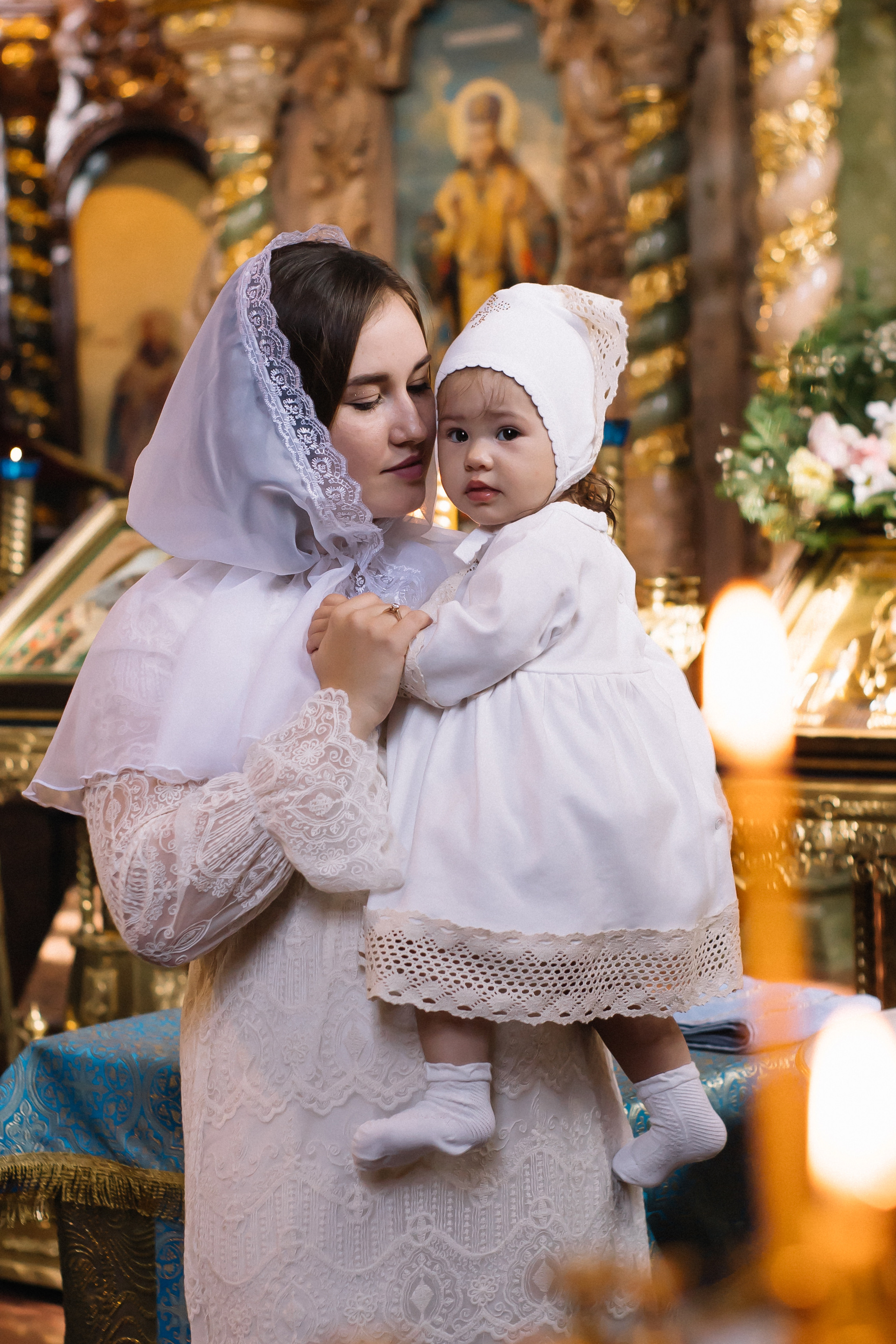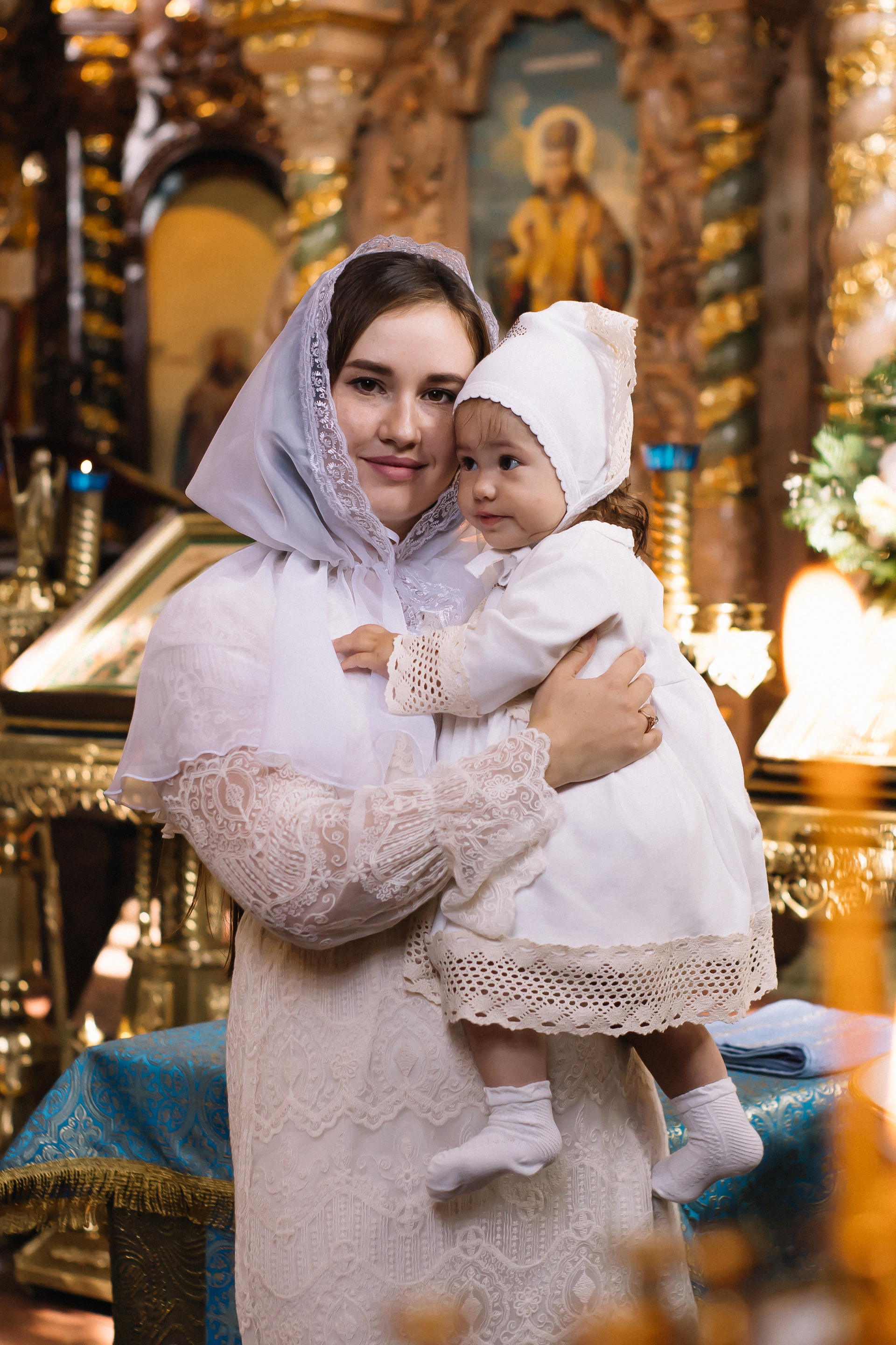 По организации. Обычно фотограф приезжает на Крещение за 30 минут до начала. Мы встречаемся около церкви, делаем общее фото, родителей с малышом, крестных, бабушек, снимаемся на фоне храма, я даю рекомендации крестным, как лучше стоять и держать ребенка. Дальше — фотосъемка непосредственно Таинства, после — можно попросить батюшку сфотографироваться с вами в Храме, сделав общую фотографию. А, если малыш в настроении — несколько постановочных кадров с мамой, папой.