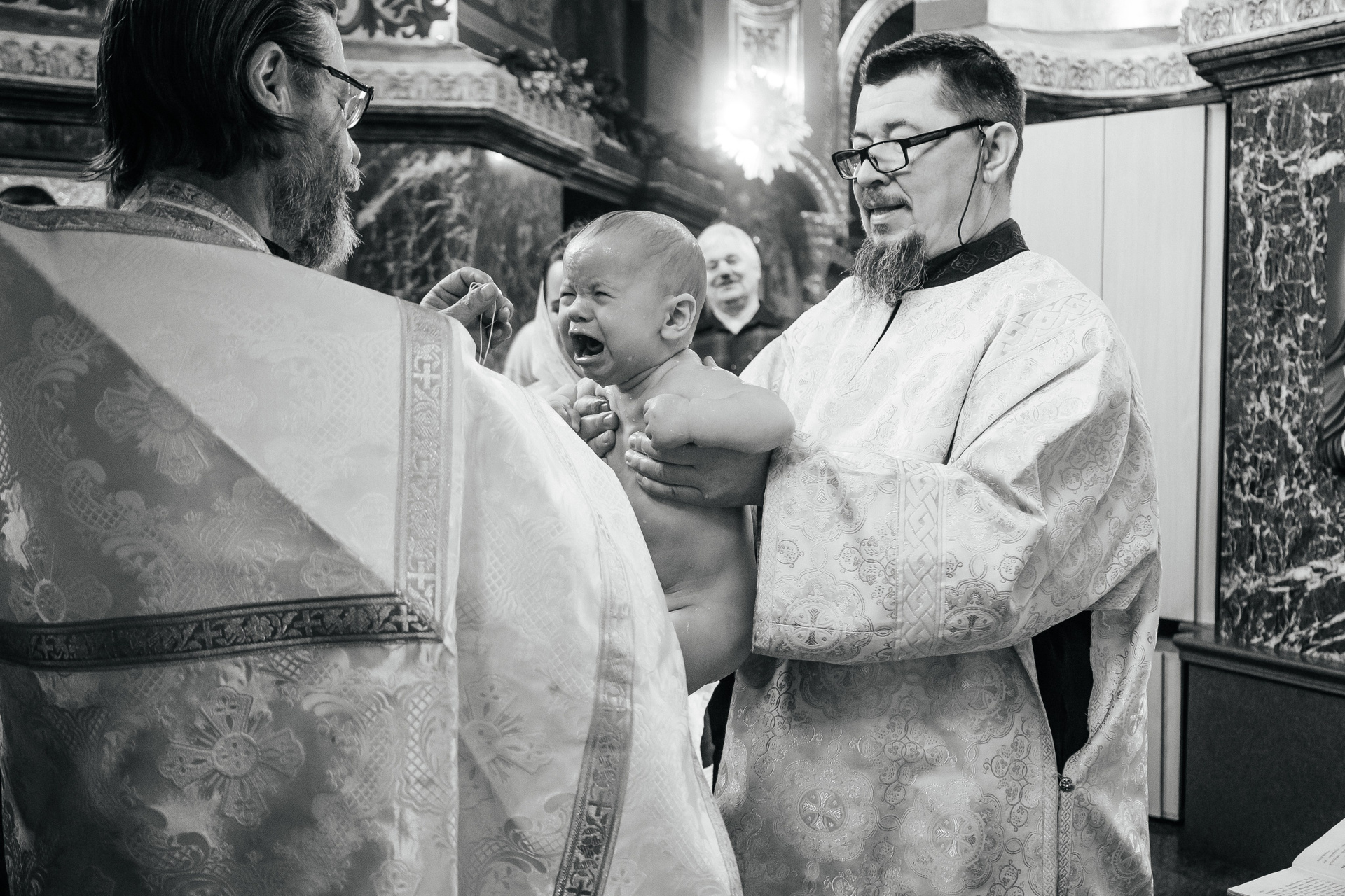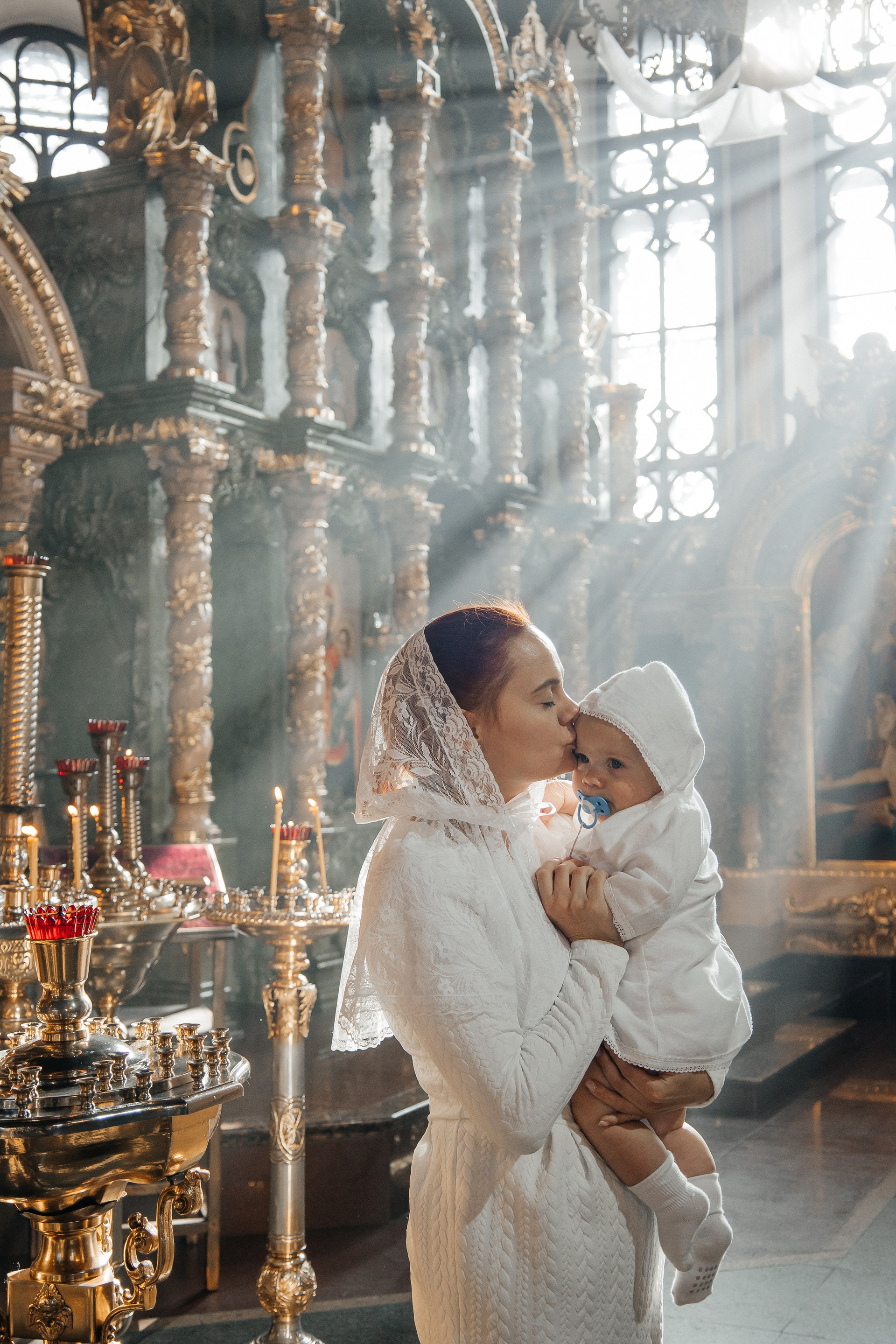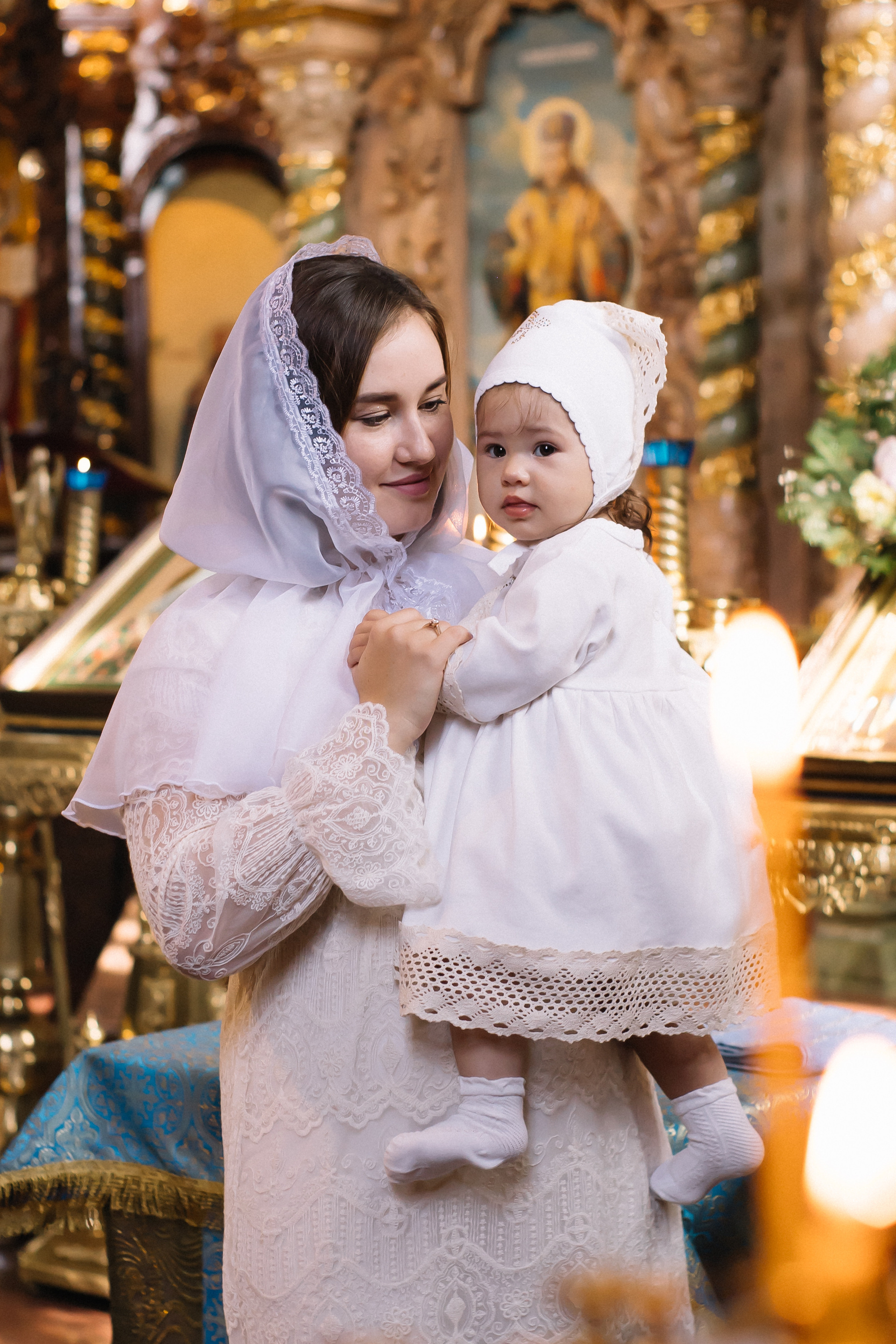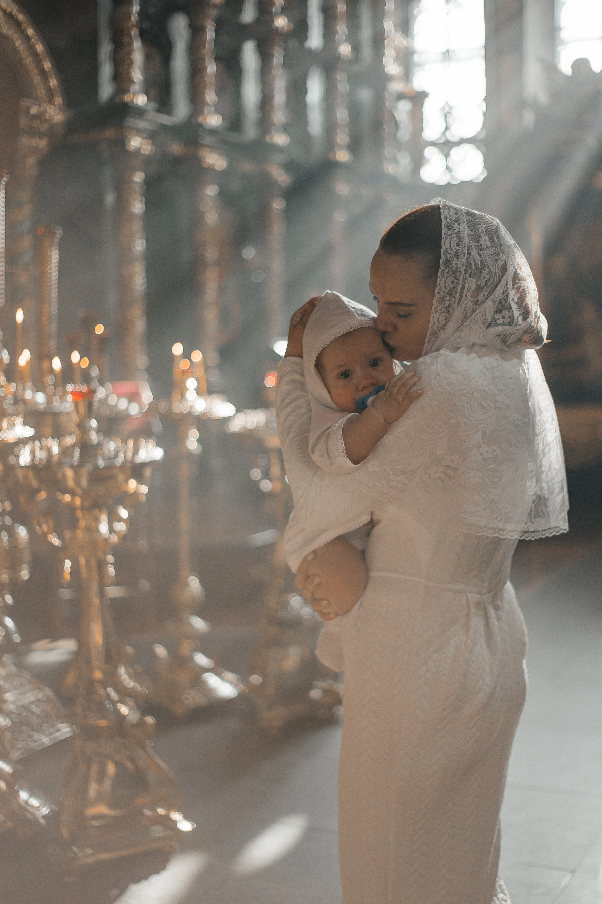 По организации. Обычно фотограф приезжает на Крещение за 30 минут до начала. Мы встречаемся около церкви, делаем общее фото, родителей с малышом, крестных, бабушек, снимаемся на фоне храма, я даю рекомендации крестным, как лучше стоять и держать ребенка. Дальше — фотосъемка непосредственно Таинства, после — можно попросить батюшку сфотографироваться с вами в Храме, сделав общую фотографию. А, если малыш в настроении — несколько постановочных кадров с мамой, папой.